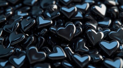 A pile of small black hearts in a 3D-rendered design creates a dramatic yet subtle love-themed background for Valentine s Day or romance concepts.