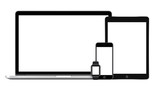 Laptop with black tablet pc smartphone and smartwatch responsive mockup front view