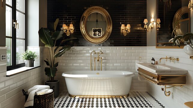 A Hollywood Regency bathroom with black and white tiles, marble vanity, gold fixtures, a large mirror with an ornate frame, and elegant lighting, creating a luxurious and stylish atmosphere,
