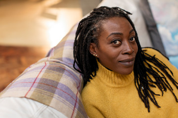 Close up portrait of kind black senior woman smiling at camera at home, copy space