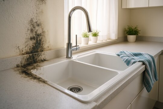 Deteriorating kitchen environment with extensive black mold consuming the wall above a sparkling modern sink, indicating a severe water damage issue