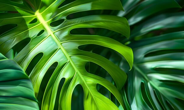 Monstera or Swiss Cheese Plant leaf. Close up beautiful green leaf of monsterra tree isolated on black background.
