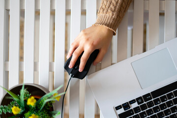 Top view of laptop and black mouse on brown wooden table background