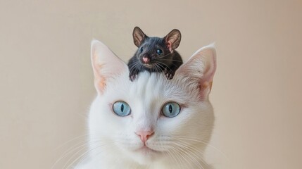 A humorous and adorable scene of a white cat with striking blue eyes, looking surprised as a small black mouse perches on its head.