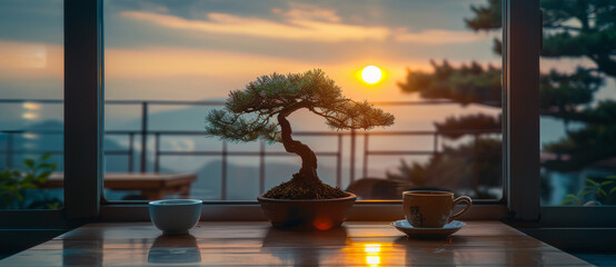 A Japanese black pine bonsai on a single panel, inside a simple cafe, moody lighting, sunset. Generative AI.
