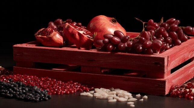 Red wooden crate filled with grapes and cherries on black table for natural organic market photography concept