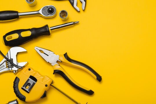 Craftsman tool on black cement background. Copy space for your text. Concept of maintenance to be reused as before.