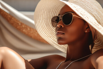 Beautiful Black woman applies sunscreen sitting by pool in summer sun