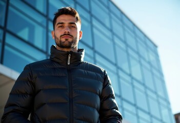 Confident man in a black puffer jacket standing outside a modern building