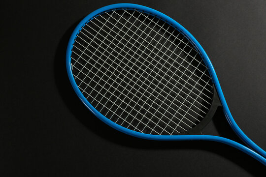 Tennis racket on black background, top view. Sports equipment