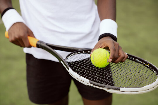 Close-up of the hands of tennis player of African appearance holding racket and placing yellow tennis ball on it and ready to serve. He is wearing white t-shirt and wristbands and black shorts.