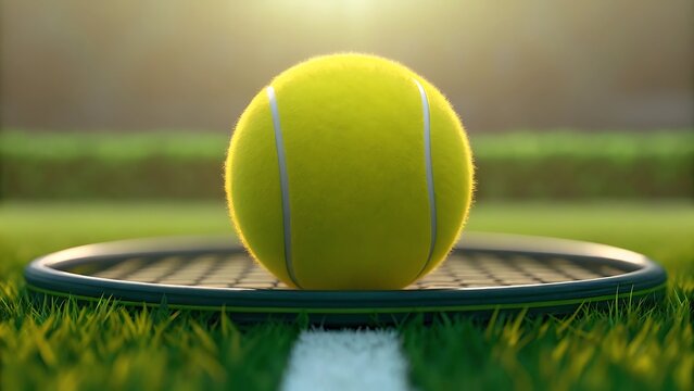 Bright yellow tennis ball resting on black racket over green grass with soft golden light and blurred tennis court background