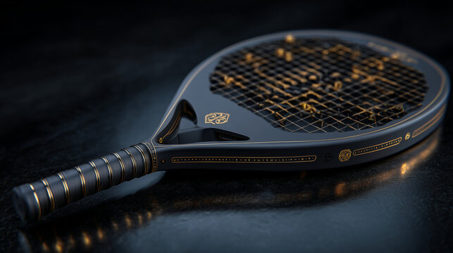 Matte black racket with gold accents on reflective surface