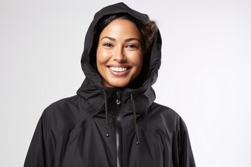 Portrait of a beautiful woman in a black raincoat with hood