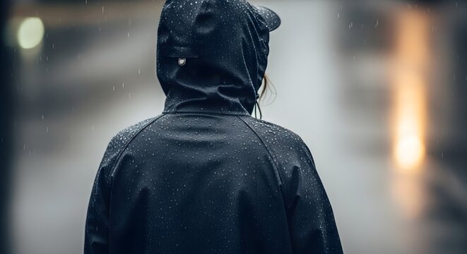 Person wearing a black hooded raincoat standing in the rain with blurred background and water droplets