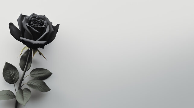 Minimalist Sympathy Condolences card. Black rose on a muted grey background. Funeral concept. Copy space