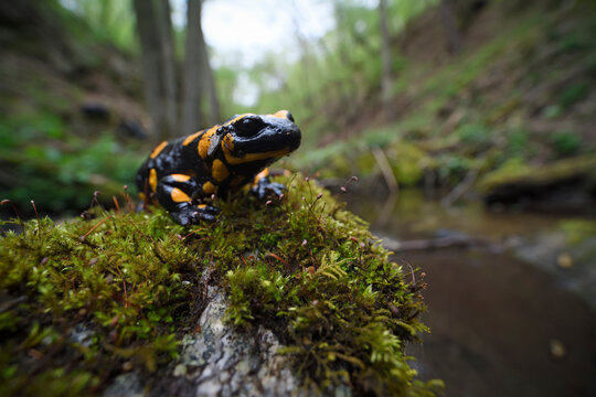 Fire salamander at moss stone