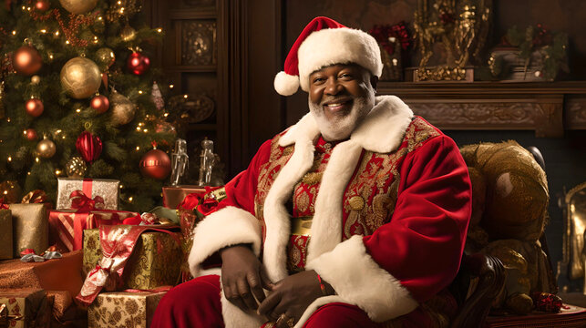 black santa claus, preparing gifts for christmas day, african american santa claus