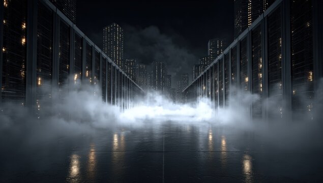 A vast server room, with symmetrical corridors of sleek black server racks, extends to the horizon. Electric blue and lime green light lines flow and pulsate through the server panels