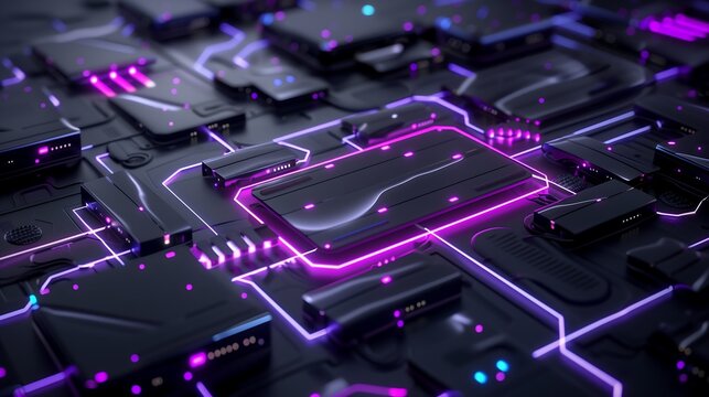Streaming neon binary across server racks with circuitry graphics in futuristic data center