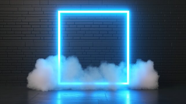 Glowing neon blue square frame is mounted on a black brick wall, with smoke or fog billowing at the base, creating a dramatic and vibrant scene