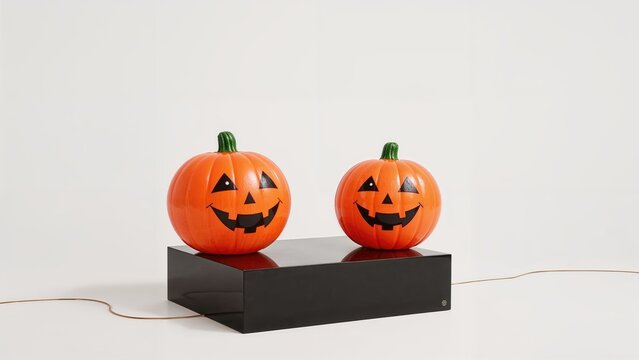 Three smiling-faced orange pumpkin air balls on a black square base for Halloween decor, with a white background and a path.