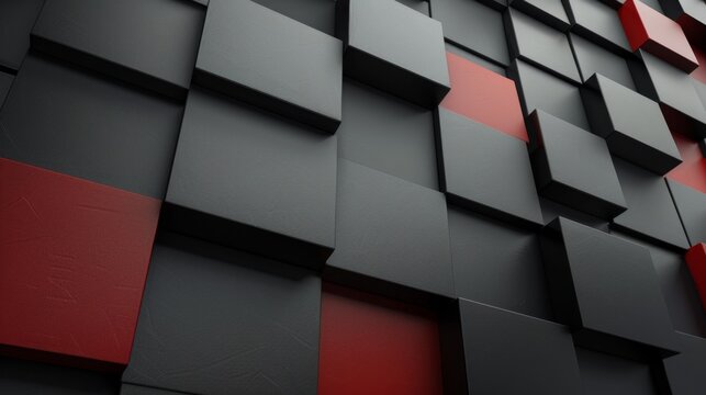 A close-up view of an abstract geometric pattern made of black and red cubes, arranged in a repeating and overlapping configuration.