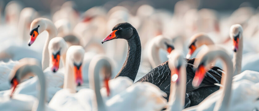 A striking black swan gracefully swims among a group of white swans, showcasing a beautiful contrast in nature.