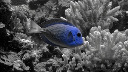 Black and white tropical seascape negative colors, single blue tang fish swimming