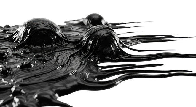 Obsidian-black, viscous goo forms undulating tendrils & coalescing globs, spreading on a stark white background with dramatic rim lighting, extreme macro, low-angle shot, concept of primeval dread