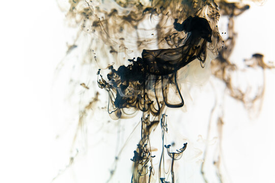 Black ink swirls forming delicate patterns as they diffuse elegantly through clear water, resembling an abstract ballet.