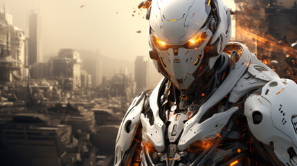 Futuristic cybernetic android with glowing eyes and digital glitches