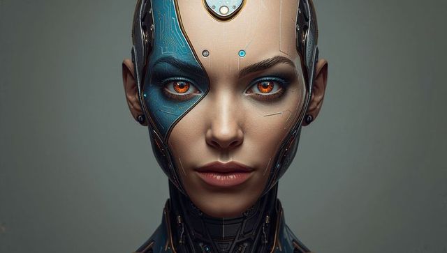 Holographic android face displaying cyan neural grid and futuristic circuitry