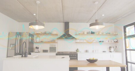 Bright audio visualization displays sound waves with vibrant neon colors.