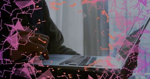 Mature woman typing on laptop with pink purple geometric tech overlay for remote work