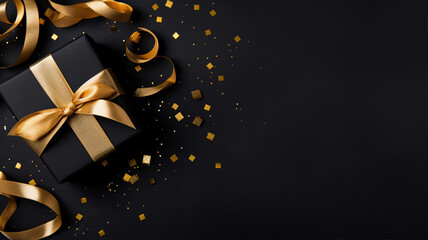 First person top view photo of hands tying red ribbon bow on black giftbox on isolated black background