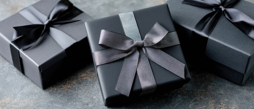 Mysterious Gifts: A collection of meticulously wrapped black gift boxes, each adorned with a luxurious silk ribbon, arranged artistically, creating a sense of anticipation and elegance.