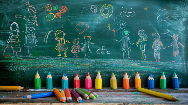 colorful children's drawings on a blackboard with a wooden frame