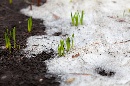 Top view of Green leaves on fresh black soil with mulch for gardening, black land, Concept of global pollution, World Soil Day and Environment conservation