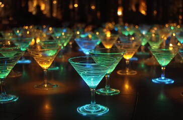 A photo of a glow-in-the-dark party with many glowing martini glasses on a table.