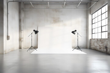 white photography studio backdrop with two black light stands in huge open warehouse space