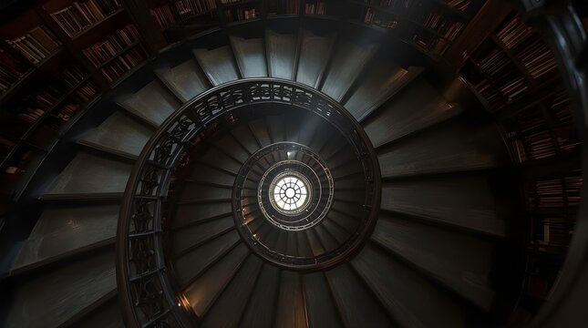 A highly detailed architectural photo of a spiral staircase inside a historic library, made of dark wood, lit by a single beam of sunlight