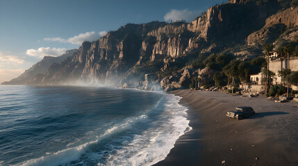 Dramatic Mountain Coastline with Black Sand Beach and Ocean Waves at Sunrise