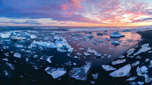 Icelandic Iceberg Sunset A Breathtaking Panorama of Black Sand Beach Serenity