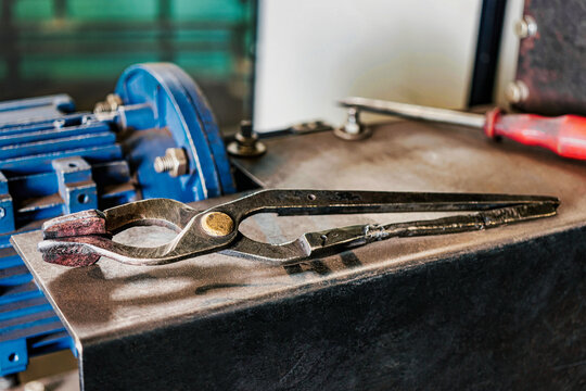 Blackmith tools in worksshop different pliers and hammers