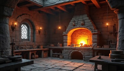 Glowing Forge in a Rustic Medieval Blacksmith s Workshop with Warm Lighting