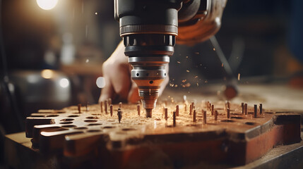 Skilled blacksmith working hot metal with a hammer on an anvil, creating a shower of fiery sparks in a traditional workshop, symbolizing handicraft, craftsmanship, hard work, and metalworking