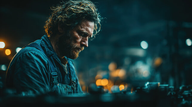 Blacksmith working on an anvil in a dimly lit forge creating handmade tools with a hammer during a quiet afternoon