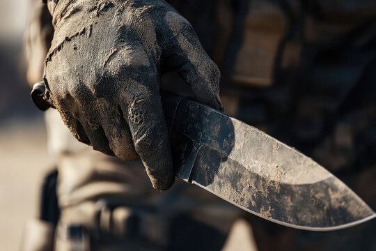 A dirty hand is holding a sharp bladed knife carefully