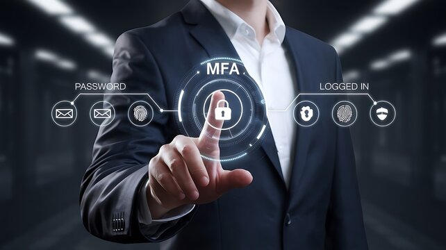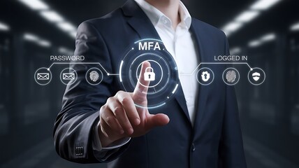 businessman pressing the virtual button MFA, multi-factor authentication. cloud computing concept, cloud technology, Saas, Paas, Iaas. AWS Services, ips, SSL, mfa, 2fa